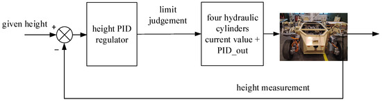 When the active suspension system is leveled, the gyroscope attitude is first read according to the information of α and β to determine which attitude the body is in. When the body is in the front high/rear low state, the angle of β is approximately 0 and the angle of α is greater than 0, according to which the state is designed to be adjusted by the PID closed loop. The input of this state is α = 0, and the output of the PID controller acts on the front and rear hydraulic cylinders to make the front two hydraulic cylinders’ wheel legs move downward and the rear two hydraulic cylinders’ wheel legs move upward, adjusting the body attitude to put the body in a horizontal state. The PID closed-loop adjustment of the front high/rear low attitude is shown in Figure 6. The photograph in Figure 6 is a picture of the vehicle. “↑” represents upward movement. “↓” represents downward movement.