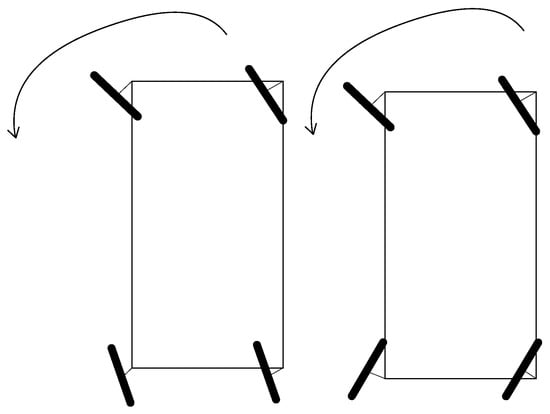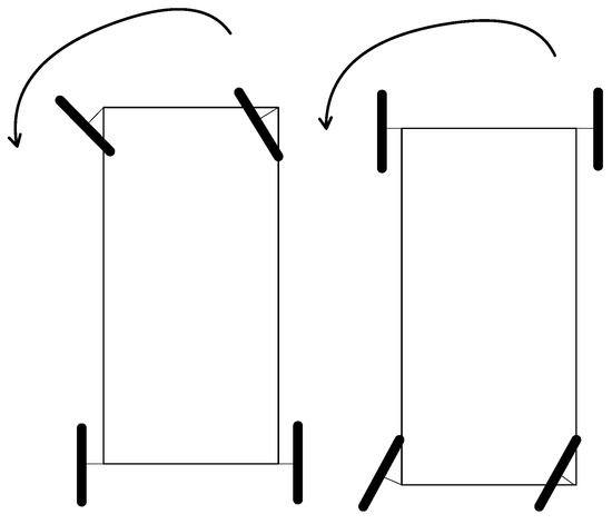 To ensure smooth maneuvering and prevent sideslip during turns, the active suspension adjusts the deflection angle of the inner and outer tires differently, resulting in a smaller turning radius for the inner tires. With each of the four wheel legs operating independently, software control is necessary to manage the steering angle of the inner and outer tires during turns, following the Ackermann steering principle. Active suspension steering includes two-wheel cornering steering and four-wheel cornering steering. Two-wheel cornering steering includes front-wheel and rear-wheel cornering steering, while four-wheel steering comprises four-wheel same-direction and four-wheel reverse steering. Various active suspension steering configurations are depicted in Figure 17 and Figure 18. The direction of the arrow indicates the turning direction.