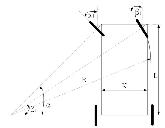 Figure 19 illustrates the front-wheel Ackermann steering model during cornering with active suspension. This model delineates the correlation among the steering angles of the front inboard and outboard wheels, the body length, the wheelbase, and the turning radius. During the Ackermann steering process, α1 is the actively given angle and β1 is the angle calculated based on α1.