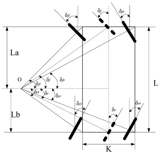 where La is the distance from the steering instantaneous center of the circle to the front axle and Lb is the distance from the steering instantaneous center of the circle to the rear axle. Transforming Equation (9), the expressions of La and Lb are