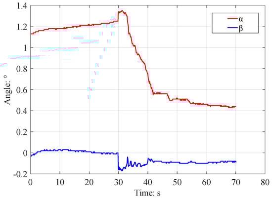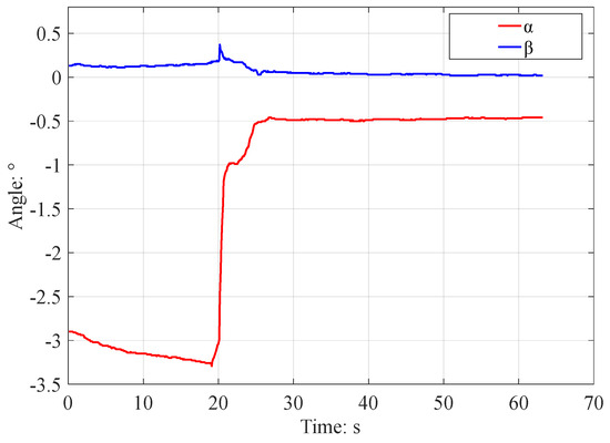 Figure 23 shows the angular change curve of automatic leveling after manually adjusting the adaptive active suspension system to the state of the high front−left corner. The value of β in the initial state is near 0°, and α is 1.2°. During the leveling process, α decreases gradually and the change in the angle of β is not obvious. After automatic leveling, β approaches −0.1°, 0° < α < 0.5°, which meets the maximum angle deviation value of the system and achieves the set leveling effect.