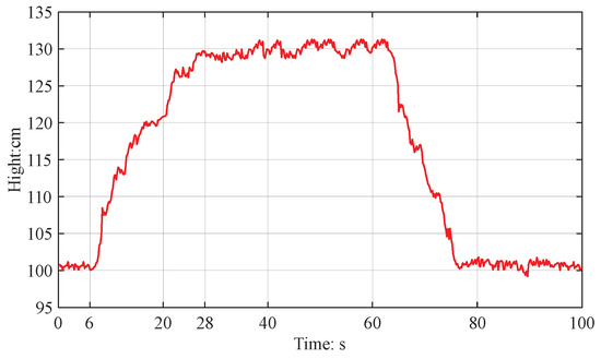 In the process of active suspension height adjustment, the allowable height value has a certain error; the smaller the error value is, the higher the system leveling accuracy, but the longer the system adjustment time. To consider the accuracy of the height adjustment and the leveling time, the allowable error of the height is 5 cm. The body height is set through the remote control during the experiment, and the total controller controls the four wheel leg hydraulic cylinders for the height condition according to the height sensor measurement data. The starting moment for adjusting the body height to 100 cm and the experimental process for recording the height sensor change data are shown in Figure 24.