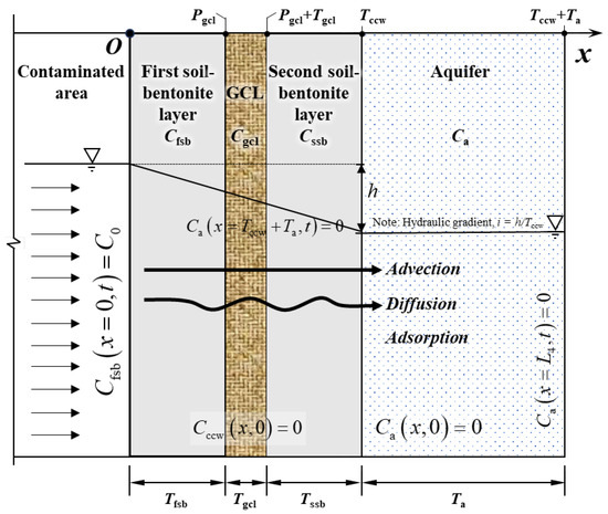 - The present solution can well accommodate contaminant advection–diffusion–adsorption transport through a SB/GCL/SB CCW and aquifer system. It is a practical tool for the design and optimization of the GCL-enhanced CCW by assessing the breakthrough processes of contaminant transport in the CCW system.