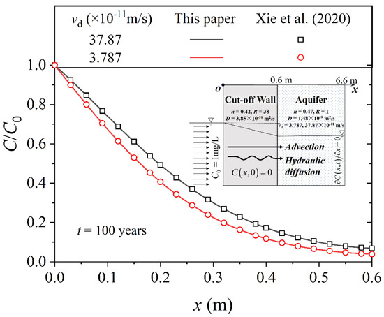 - Yan, H.; Xie, H.; Wang, S.; Zheng, Z. A two-dimensional analytical model for organic contaminant transport in cutoff wall and aquifer system. Num. Anal. Meth. Geomech. 2021, 45, 631–647. [Google Scholar] [CrossRef]