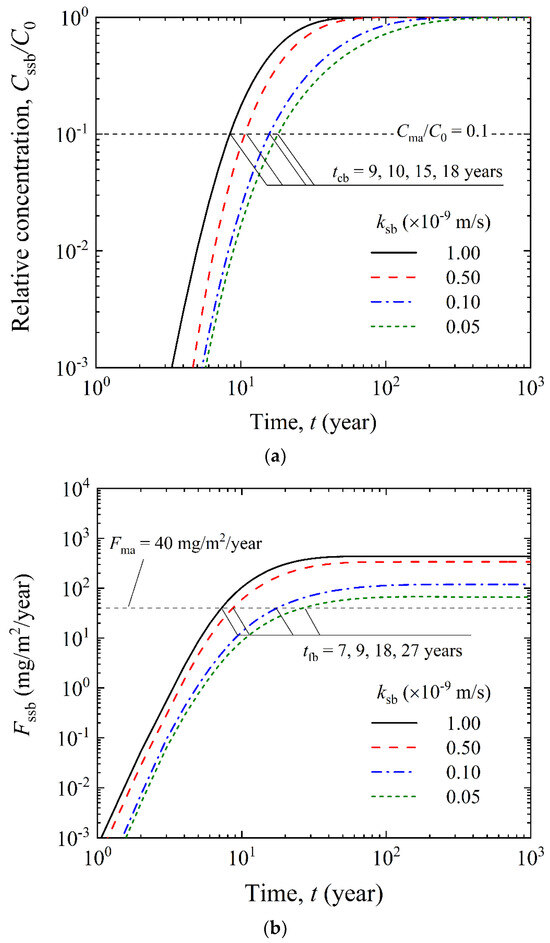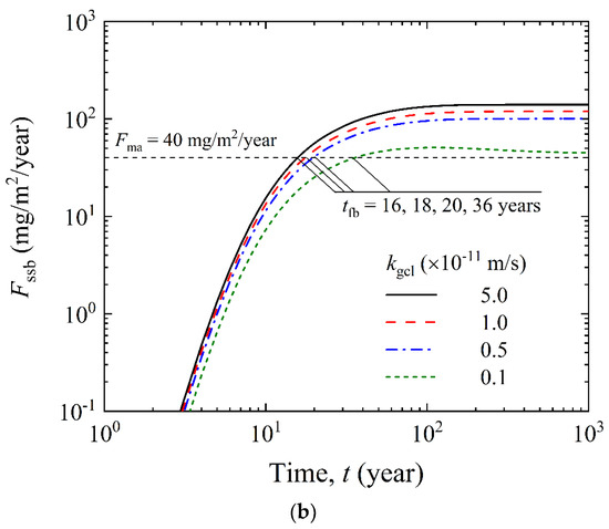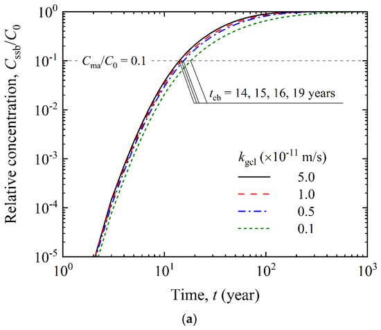 - Exploring any strategies to reduce the hydraulic conductivity of GCL (kgcl) and SB (ksb) could significantly improve the barrier performance of GCL-enhanced CCW. For instance, reducing kgcl from 5.0 × 10−11 m/s to 1 × 10−12 m/s would increase tcb from 14 to 19 years, an increase ratio of 36%. Similarly, reducing ksb from 1.0 × 10−9 m/s to 1.0 × 10−11 m/s would increase tcb from 9 to 18 years, an increase ratio of 100%.