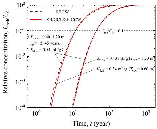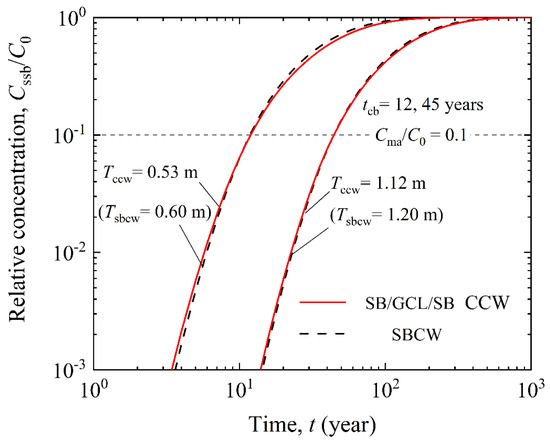 - To achieve equivalent contaminant barrier performance, SBCW requires a greater thickness compared to SB/GCL/SB CCW. Specifically, for tcb of 12 years and 45 years, SBCW requires thicknesses of 0.60 m and 1.20 m, respectively, while the corresponding SB/GCL/SB CCW only requires 0.53 m and 1.12 m. This indicates that GCL can reduce the amount of bentonite soil needed.