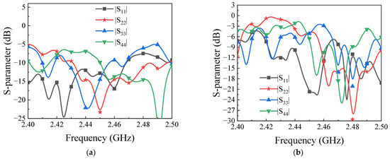 S-parameter between 2400 MHz and 2500 MHz. (a) Temperature is at 21 °C. (b) Temperature is at 180 °C.