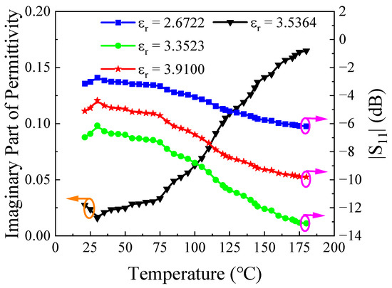 During simulation, when one port is fed at 2.48 GHz, the permittivity varies with temperature, implying that the equivalent dissipation changes over time. Figure 6 displays the curves illustrating the variation of the imaginary and real parts’ influence |S11| on a one-to-one basis. Considering the smaller variation range of the permittivity real part, the effects of dissipation on the reflection coefficient are much stronger than those from impedance matching, which depends on the low dielectric loss characteristics of PETs. We compared the negative correlation of the imaginary part to |S11| at various real parts of 2.6722, 3.3523, and 3.9100.