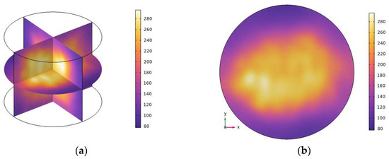 We acquired the PET temperature distribution through multi-physical simulation, incorporating the variation of permittivity based on temperature. Figure 7 and Figure 8 illustrate the temperature distribution for fixed frequency and frequency adjustment, respectively. For fixed frequency, we simulated the temperature distribution at 2.414 GHz. Compared to variable frequencies changed from 2.4 GHz to 2.5 GHz with an interval of 10 MHz, the maximum temperature difference is more than 100 °C, which means uniformity is enhanced when inputting power is at 800 W and drying time is less than 60 min. After calculations, the COVT decreased from 55.63% to 34.65%, proving the uniformity improvement.