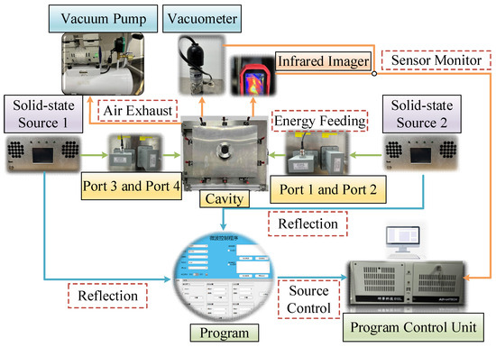 Those monitor data can reflect the drying process. Using a vacuum pump, the cavity was exhausted to −92 kPa, which is relative to standard atmospheric pressure (101.325 kPa). Two SSGs were placed on both sides to input four channels from 0 W to 250 W, controlled by the computer’s series ports (Figure 9).