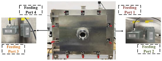 As depicted in Figure 10, observing windows were designed with a cut-off waveguide structure. Considering the coupling effects, four waveguide ports were arranged in pairs perpendicularly. The spatial combination of feeds influenced the variation in power distribution, which was subdivided into three situations: on the same side, directly opposite, and obliquely opposite. All BJ-26 waveguide ports were connected to waveguide–coaxial adapters connected to the SSG.