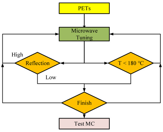 In the microwave drying process, PET materials of identical volume and mass were subjected to drying over time when temperature and microwave reflection were observed via sensors with the tuning method.