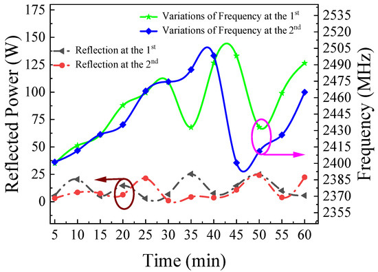 However, we selected different frequencies in the two experiments because the adjustment principle depends on reflection. When the time is 35 min, the first frequency is 2485.5 MHz, but the second is 2432.9 MHz. At this moment, the reflection power difference is about 20 W.