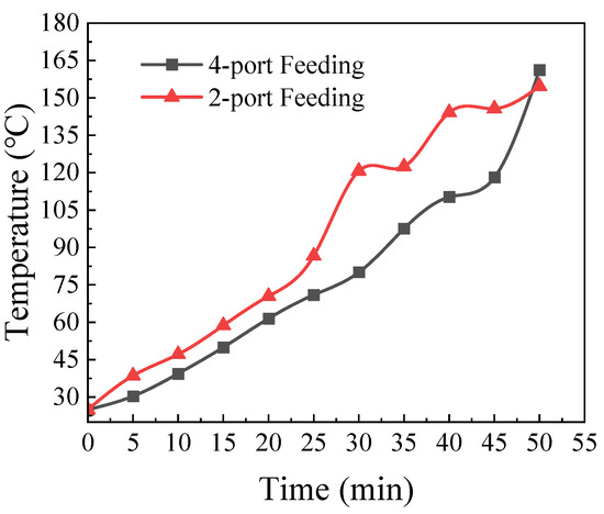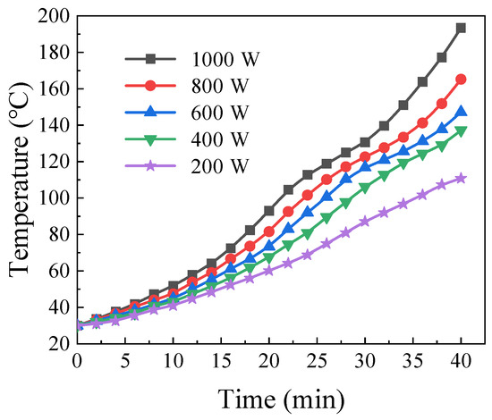 Adopting the four-port feeding method, we conducted numerous experiments at each port with power levels of 50 W, 100 W, 150 W, 200 W, and 250 W, respectively. The recorded temperatures are shown in Figure 17. When the total power is set to 1000 W, the temperature reaches 193.4 °C in 40 min. However, the higher the input power, the higher the reflection power consumed.