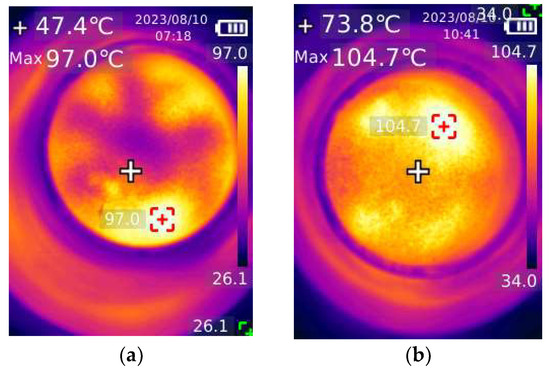 We recorded temperature distributions every 5 min using an infrared thermometer (UTi-260B). The recorded temperatures are shown in Figure 13.