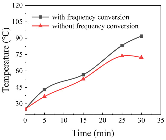We obtained the average temperature data, shown in Figure 15, through the quantification indices program. In both cases, temperatures are directly proportional to drying time. The temperature curve of the variable-frequency method is smoother than the fixed-frequency method; thereby, the advantages of frequency adjustment have been proved.