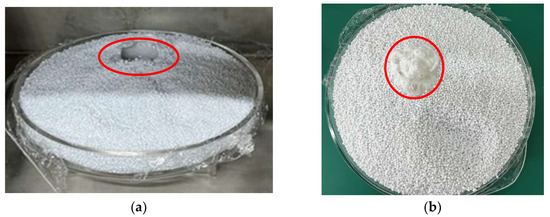 Both fixed-frequency and variable-frequency drying were conducted with a four-port type when each port was fed by 200 W to dry 2 kg PETs. As depicted in Figure 14, the standard deviation of Figure 14a is 13.85 larger than 12.92 in Figure 14b, which is consistent with fixed-frequency drying exhibiting a clear boundary between hot and cold spots. However, the standard deviation may be influenced by the measurement error. Conversely, the microwave drying process observed a more even color distribution and lower temperature differences, 30.9 °C less than 49.6 °C at 2.48 GHz.