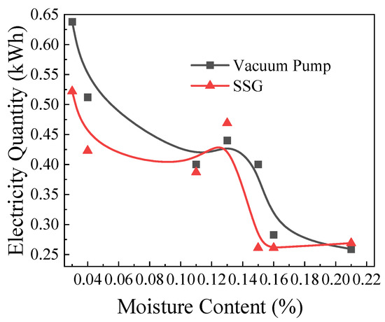 To further assess the advantages of the adjustment method for PET drying, we measured the electricity quantity using an electricity meter. As depicted in Figure 18, electricity quantities were recorded when each port of the SSG was set at 150 W, and microwave drying time was restricted to approximately one hour. When power was at 150 W, the MC values were negatively correlated to the drying times and the electricity quantities. However, for an MC of 0.13%, reflection augmentation will consume more energy due to the higher reflection in the whole band, which may be caused by awkward frequency tuning.