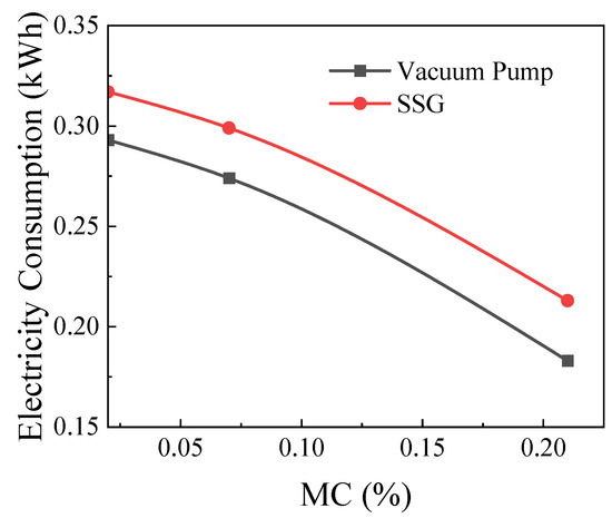 It is worth noting that the vacuum pump’s variation tendency is consistent with the SSG one. When power is at 150 W, the vacuum pump’s contribution to energy consumption exceeds that of the SSG.