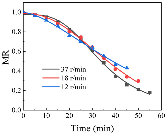 We studied the effect of rotation rate at 800 W when drying time was limited to 60 min for 2 kg of PETs. By calculating the error of different rotation rates, the R-square of 37 r/min, 18 r/min, and 12 r/min are 0.99739, 0.9970, and 0.99721, respectively. When drying time reaches around 30 min, the decreasing rate of the MR becomes faster.