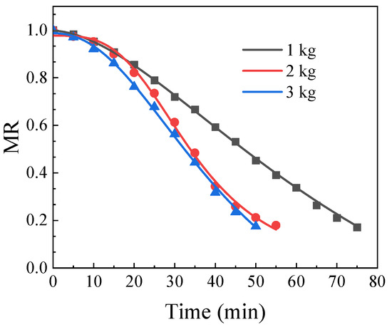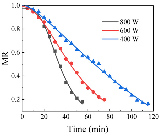 Similarly, the R-square of 800 W, 600 W, and 400 W is 0.99739, 0.99855, and 0.99717 at 2 kg, respectively. The rate of descent increases with the increase in input power. In summary, efficiency promotion can be implemented by increasing the rotation rate and input power controlled within one hour through the frequency adjustment method. Due to the fitted metrics of the logistic model close to 1, we can explain the values of A1, A2, , and p to predict the tendencies.