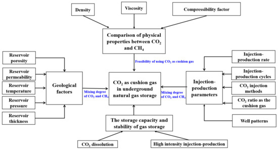 At present, the mechanism of CO2 as a cushion gas is not fully understood, and the research work is still in the exploratory stage. Thus, it is necessary to summarize the research progress regarding CO2 as a cushion gas, providing a valuable reference for engineering practice involving CO2 as a cushion gas. Regarding the environmental protection problems caused by the development of the natural gas industry and thermal power generation, CO2 as a cushion gas creates a win–win situation. It can save not only investment funds but also carbon storage and reduce the greenhouse effects [27,28]. In this paper, the effects of the physical properties of CO2, CH4, and their mixtures, as well as the geological conditions and injection–production parameters, on the mixing degree of CO2 as a cushion gas are discussed. The influence of CO2 as a cushion gas on the reservoir capacity and reservoir stability under high-intensity injection–production conditions for gas storage is analyzed. Finally, based on a summary of the literature research, the challenges of CO2 as a cushion gas are listed. The specific discussion content is shown in Figure 3.