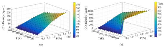 Density differences with the change in temperature and pressure [30,31,32]. (a) The density of CH4; (b) the density of CO2.