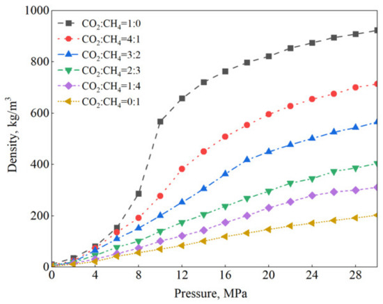 The density change of the CO2 and CH4 mixture with different ratios at 313.15 K.