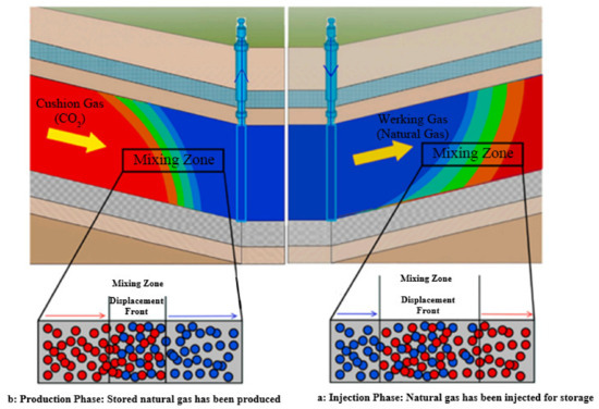 Under a certain temperature and pressure, the amount of natural gas that can be held in an underground natural gas storage facility is called the reservoir capacity, of which 25% to 75% will be retained as a cushion gas in the reservoir during operation. A cushion gas is used to inhibit the flow of formation water, provide pressure for the production of working gas, and ensure the stability of the reservoir (Figure 2) [8,9,10]. In the early days, most gas storage facilities, both domestically and internationally, used natural gas as a cushion gas. When the gas storage is abandoned, natural gas as a cushion gas is not extracted, which leads to serious capital deposition [11]. To reduce the investment cost of gas storage and enhance natural gas recovery, countries such as America and France have attempted to use inert gas as a cushion gas to replace natural gas [12]. However, there is a mixing problem between working gas and inert gas. Thus, the gas mixing phenomenon was analyzed by using a 3D model of the mixing gas before the project’s implementation, to ensure the quality of natural gas production [13,14,15,16,17]. After this, France carried out pre-inflation tests and simulated the gas storage characteristics using 3D network modeling to predict the mixing of the working gas and cushion gas in the formation. Moreover, they successfully replaced the original natural gas with 20% nitrogen (N2) as a cushion gas in the Saint Clair Sur Epte reservoir, and no N2 was detected during gas production [12]. Blicharski et al. proposed a convection–diffusion equation that was described in porous media in a mixed phase [18]. In addition, gas–gas displacement was carried out in the well area of Wierzchowice gas storage, and the simulation results were in agreement with the actual data. The mixing zone varies from tens of meters to 200 m. N2 as a cushion gas reduces the initial construction cost of gas storage. However, in the process of high-intensity injection–production peak shaving, the similar physical properties of natural gas and N2 render them easy to mix, and the recovery and enthalpy of natural gas are reduced. In more serious cases, the dynamic characteristics of the gas storage are changed, resulting in local blockage [19]. Therefore, it is particularly important to find a cheap gas with a large difference in physical properties compared to CH4 (the main component of natural gas) for use as a cushion gas.