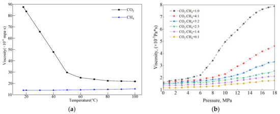 (a) The changes in the viscosity of CO2 and CH4 with temperature at 10.3 MPa [37]. (b) The viscosity change of the CO2-CH4 mixture at 313.15 K.