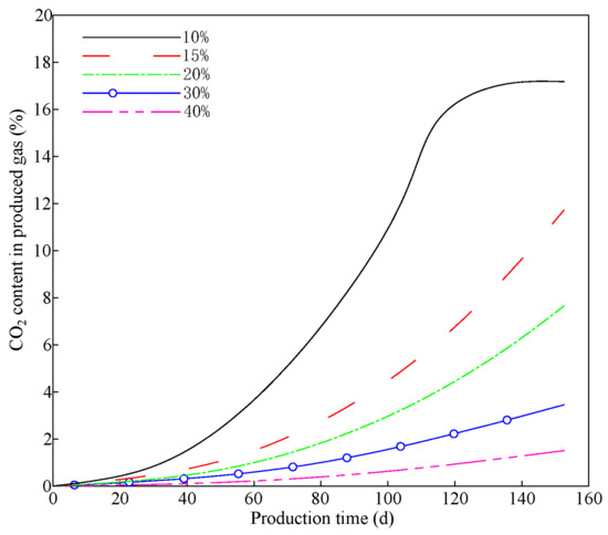 The porosity determines the migration and diffusion abilities of the cushion gas and working gas in the pore spaces of reservoirs. The larger the porosity, the faster the diffusion between the gas molecules, resulting in the stronger mixing and diffusion abilities of the two gases. However, the migration speed and the development of the mixed gas zone are slowed in a reservoir with CO2 and CH4. By simulation, Hu and Sadeghi showed that an increase in porosity reduces the mixing of the produced gas and cushion gas [36,40]. Based on the simulation of the injection of CO2 as a cushion gas for reservoirs with different porosities, Wang’s results indicated that the porosity of the CO2 cushion gas reservoir was 10%, and the molar content of CO2 in the recovered working gas was significantly higher than that at other porosities (Figure 10) [15]. At the end of natural gas production, the molar content of CO2 in the CH4 produced is close to a certain value. This is due to the small pores, which reduce the space for gas activity and increase the flow rates of CO2 and CH4, accelerating the degree of mixing. Moreover, the gas production quickly reaches its limit, and the CO2 cushion gas around the production well breaks through earlier and is extracted [42]. To control the development of the mixed gas zone, the amount of CO2 cushion gas should be appropriately reduced with the reduction in the reservoir porosity.