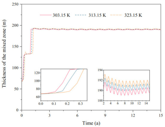 It is known that the temperature affects the physical properties of CO2 and CH4. A higher reservoir temperature leads to an increase in the diffusion coefficient of the gas molecules, affecting the degree of mixing between CO2 and CH4. Wang and Li explored the influence of the temperature on the mixing degree of CO2 and CH4 through numerical simulation methods. The simulation results indicated that as the temperature increased, the change in the CO2 molar content in the produced working gas was small [15,43]. Cao et al. pointed out that, during the production stage of the working gas, the width of the mixed gas zone decreases with an increase in temperature [46]. This is due to the high reservoir pressure caused by the increase in temperature, which increases the dynamic viscosity of the gas, thus reducing the mixing degree of CO2 and CH4. The width of the mixed gas zone increases after CH4 injection, which is because molecular diffusion plays a dominant role and the diffusion coefficient is high, but the changing trend of the mixed gas zone is not obvious (Figure 12). This is consistent with the simulation results of the multi-component seepage mathematical model established by Ma et al. [32]. Although the temperature of the reservoir changes during the operation of the gas storage facility, it has almost no effect on the degree of mixing of CO2 and CH4.