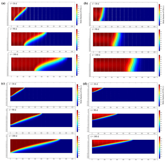 (a) The fluid dynamics coupling model was used to calculate the distribution of a mixed zone with a reservoir thickness of 22 m after natural gas injection for 30, 90, and 180 days, considering gravity effects. (b) Without considering the gravity effect, the fluid dynamics coupling model was used to calculate the distribution of a mixed zone with a reservoir thickness of 22 m after natural gas injection for 30, 90, and 180 days. (c) The fluid dynamics coupling model was used to calculate the distribution of a mixed zone with a reservoir thickness of 50 m after natural gas injection for 30, 90, and 180 days, taking into account the gravity effect. (d) The fluid dynamics coupling model was used to calculate the distribution of a mixed zone with a reservoir thickness of 100 m after natural gas injection for 30, 90, and 180 days, taking into account the gravity effect. (Blue represents CO2 cushion gas, red represents natural gas, and the remaining colors indicate mixed zones. Natural gas is injected into the reservoir from a distance of 3 m from the upper left corner [32].)