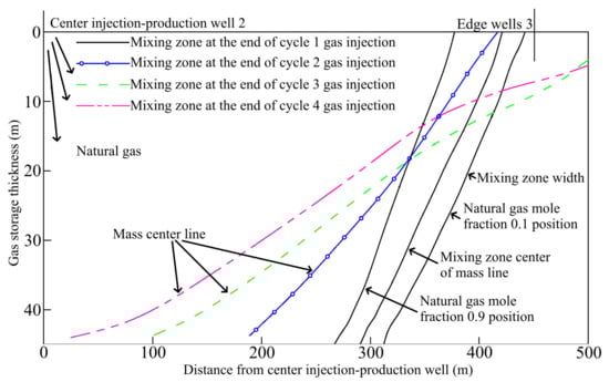 The injection–production cycles of the gas storage have a significant impact on the mixture degree of the working gas and CO2. Wang and Li pointed out that, after the fourth injection–production cycle, the CO2 content in the produced working gas was about 50 times higher than that in the first injection–production cycle [15,43]. The average reservoir pressure decreases by 0.6 MPa for gas storage after four injection–production cycles. As shown in Figure 15, Niu simulated the injection–production cycles of CO2 as a cushion gas in fractured underground natural gas storage [45]. It was found that as the injection–production cycle was prolonged, the mixing degree increased for CO2 and CH4, and the mixing gas zone gradually approached the CH4 production well. The injection–production cycles intensified the gas disturbance in the gas storage facility, and the range of mixed gas zones increased accordingly. However, the mixed gas zone is still in a layered distribution, which is the result of gravity due to the density difference between CO2 and CH4. To reduce the impact of the injection–production cycles on the degree of mixing, after each injection and production stage, the well should be shut down for some time before proceeding to the next cycle of injection–production, which is more conducive to controlling the mixed gas zone.