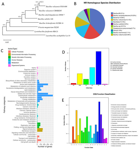 Evolutionary relationships, genome annotation, and gene classification of VC3. (A) Phylogenetic neighbor-joining tree reconstructed based on 16S rRNA, atpD, gyrA, gyrB, recN, topA, uvrC, ftsZ, and infB genes of the selected strains of bacteria; (B) NR homologous species distribution of VC3 genome; (C) KEGG functional classification of VC3 genome; (D) CAZy gene classification in the VC3 genome; (E) COG functional classification of VC3 genome.