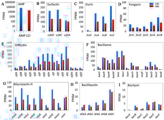 As shown in Table S1, gene expression was detected in 3539 (90.12%) and 3353 (85.38%) genes of VC3 after 24 h and 48 h of incubation, respectively, of which 1078 (30.46%) and 913 (27.23%) were highly expressed genes (FPKM > 60). An analysis of the relative expression levels of the antimicrobial gene clusters showed that the synthesized genes for AMP, surfactin, iturin, difficidin, bacillaene, and macrolactin H were highly expressed genes, whereas the fengycin, bacillibactin, and bacilysin gene clusters were relatively lowly expressed genes (Figure 3).