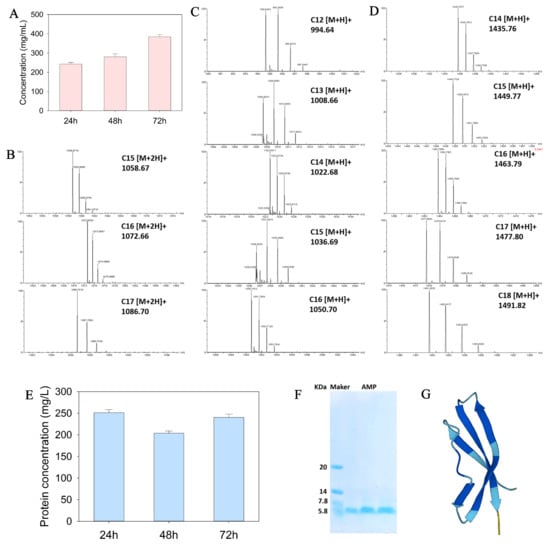 Separation, purification, and characterization of LPs and AMP. (A) Content of LPs in broth; (B) molecular ion peaks of three iturin monomers; (C) molecular ion peaks of five surfactin monomers; (D) molecular ion peaks of five fengycin monomers; (E) content of AMP in broth; (F) SDS-PAGE of AMP; (G) protein structure of AMP.