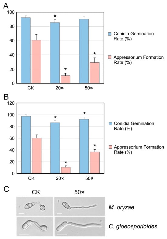 Conidia play important roles during M. oryzae and C. gloeosporioides infection, and therefore, the effect of VC3 free-cell filtrates on the spore germination and appressorium formation of both fungal pathogens was investigated. It was observed that, treated with 50 × VC3 free-cell filtrates, the spore germination rate of M. oryzae was significantly lower. Compared with the control (60.8%), the rate of appressorium formation was 10.7 and 29.4% after being treated with 20× or 50× VC3 free-cell filtrates (Figure 5A). Similar results were obtained in C. gloeosporioides. The 20× or 50× VC3 free-cell filtrate treatments saw reduces of 11.5% or 5.0% in spore germination, and only 10.6% or 36.7% of the germ tubes formed appressorium (Figure 5B,C). The results indicated that VC3 free-cell filtrates displayed highly efficacy in reducing the appressorium formation of M. oryzae and C. gloeosporioides.