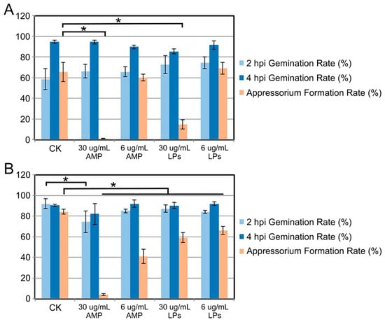 Effect of AMPs and LPs on inhibiting conidia germination and appressorium formation of M. oryzae (A) and C. gloeosporioides (B). CK: control, treated with sterile distilled water; AMPs or LPs: treated with AMPs or LPs at a final concentration of 30 μg/mL or 6 μg/mL. The error bars represent the standard errors. The asterisks (*) represent significant differences compared with CK according to the multiple Duncan test (p < 0.05). Corresponding ANOVA results: 2 hpi or 4 hpi conidia germination and appressorium formation of M. oryzae, F4,10 = 2.218, p = 0.140, F4,10 = 6.865, p = 0.006, F4,10 = 97.128, p < 0.001; C. gloeosporioides, F4,10 = 4.103, p = 0.032, F4,10 = 2.016, p = 0.168, F4,10 = 151.914, p < 0.001.