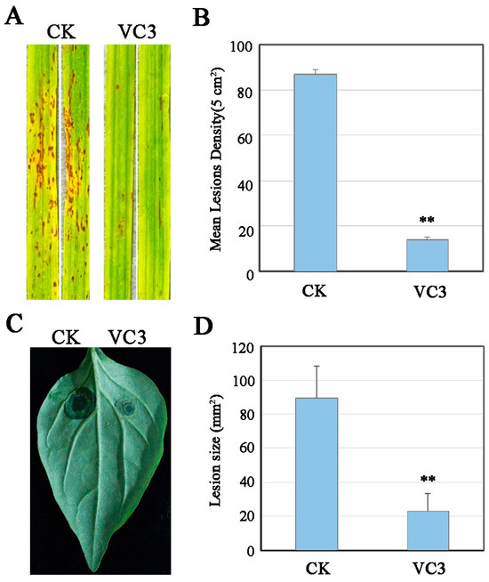 Pathogenicity assay under VC3 suspensions treatments. (A) Rice seedlings were inoculated with the conidia of M. oryzae with or without VC3 suspensions. Graph (B) shows the mean lesion density. (C) Pepper leaves were inoculated with the conidia of C. gloeosporioides with or without VC3 suspensions. Graph (D) shows the size of the lesion area. CK: control, treated with LB + glucose medium; VC3: treated with VC3 cell-free filtrates at a concentration of 10%. The error bars represent the standard errors. Asterisks above the bars indicate significant differences compared with CK according to the multiple Duncan test (p < 0.05). Corresponding ANOVA results: rice, F1,4 = 2547.368, p < 0.001; pepper, F1,10 = 57.917, p < 0.001.