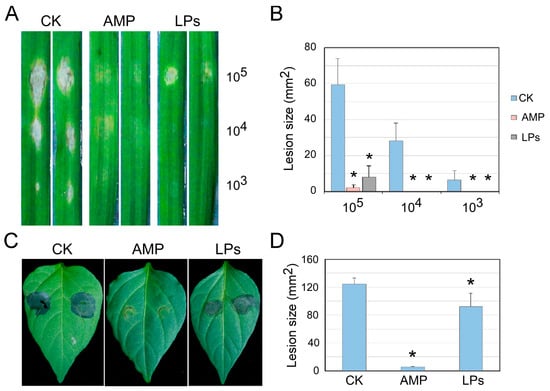 Moreover, we examined the effect of AMPs and LPs on the pathogenicity of M. oryzae and C. gloeosporioides on detached barley and pepper leaves. Conidial suspensions of M. oryzae with different concentrations were drop-inoculated onto barley leaves (Figure 8A). In comparison with the control, the AMP treatment failed to cause extensive necrosis and chlorosis at 105 conidia/mL or lower, while the LP treatment failed at 104 conidia/mL or lower. Even at 105 conidia/mL, the LP treatment was less virulent (Figure 8B). On pepper leaves, which were inoculated with the conidial suspension of C. gloeosporioides, significantly smaller lesions were found with AMP treatment, and lesions produced by the LP treatments were less severe (Figure 8C,D). The statistical analysis showed that the inhibiting effect of AMP on pathogenicity was higher than that of LPs (Figure 8B,D).