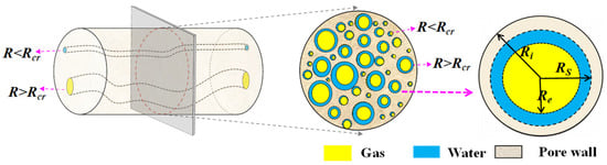 For gas–water two-phase flow in hydrophilic tight sandstone pores, it is assumed that there is a critical capillary radius Rcr. When R < Rcr, there is a single-phase water flow pattern; when R > Rcr, the capillary exhibits a “gas core water film” flow pattern [16]. Therefore, the water saturation of the nanopore characterization unit can be expressed as follows: