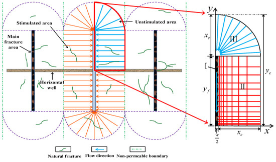 In addition, in actual low-permeability reservoirs, the interaction between natural fractures and hydraulic fractures generates secondary fractures, resulting in a complex fracture network. Therefore, further research is necessary in order to understand the impact of these complex fracture networks on the productivity of hydraulically fractured horizontal wells. Earlier productivity prediction models have not accounted for the interconnected complex fracture network formed by the primary fractures from hydraulic fracturing and natural fractures. Some models introduced idealized dual-porosity media to represent complex fracture networks, but this did not accurately reflect the actual heterogeneous fracture network structure. Although some studies have considered the heterogeneous morphological characteristics of fracture networks, the description of the non-uniform distribution of fracture networks remains unclear.