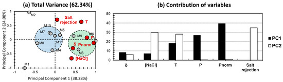(a) PCA biplot representation of datasets, excluding M1 and M2, for pervaporation desalination performance of PVA-based TFC membranes (data were obtained from the previous findings of Lai et al. [5]). Grey bullets indicate the different PVA-based TFC membranes. Red bullets indicate operational features (NaCl was removed due to the high proximity between the investigated materials). (b) The % contribution of the different variables in-hand, relative to PC1 (black) and PC2 (white).