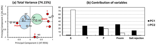 For individuals, and similarly to the PVA-based TFC membranes with added specific layers (Figure 4), no clustering was obtained, indicating the efficiency of PCA in distinguishing between these membranes. The difference resides in a higher distribution of variables for this case, unlike the exclusively positive trends of PC1 (Figure 3). Individuals can be subdivided into two different groups: one presenting a positive correlation with the investigated factors on the positive side of PC1 (Pnorm, P, and T; Figure 4a); and another group presenting a positive correlation with the investigated factors on the negative side of PC1 (δ and salt rejection; Figure 4a). This dissociation would indicate that M7, M9, and M11 are more likely suited in situations where high permeation and temperatures are present, from one side. From another side, it showed the higher reliance of M8 and M10 on salt rejection and thickness of separative layers “δ”.