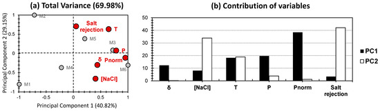 (a) PCA biplot representation of datasets for pervaporation desalination performance of PVA-based TFC membranes without any specific layers (M1 to M6; data were obtained from the previous findings of Lai et al. [5]). Grey bullets indicate the different PVA-based TFC membranes. Red bullets indicate operational features. (b) The % contribution of the different variables in-hand, relative to PC1 (black) and PC2 (white).