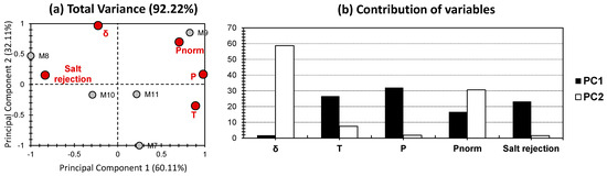 Figure 4 shows the PCA-biplot representation for datasets for pervaporation desalination performance on PVA-based TFC membranes with added specific layers (M7 to M11; Table 1). The first two PCs accounted for 92.22% of the total variance (PC1 and PC2 scoring 60.11% and 32.11%, respectively; Figure 4a). A high variance would indicate an increase in similarities between the investigated materials, and shows the high applicability of PCA for PVA-based TFC membranes with added specific layers. For variables and along PC1, moderate contributions were yielded for salt rejection, P, and T (accounting for between 20% and 30%, Figure 4a). Concerning T and salt rejection, the reader can refer to the discussion highlighted in Figure 3, applicable for the current findings, relating the temperature to the pore sizes. On the other hand, increasing temperature has a role in the growth of salt-rejection rates. However, the permeation P depends on the membrane type and on possible added layers. As a matter of fact, it was highlighted that adding Ws-OL to the PVA membrane resulted in an increase in the water permeation flux by a factor of 2.1 compared to the pure PVA membrane [42]. The main interpretation of this enhancement is due to the fact that crystalline regions of PVA membranes act as obstacles for water diffusion. Thus, adding Ws-OL to the PVA membrane reduced the crystallite sizes, making it more adequate for permeation [4]. The rest of the investigated variables scored low to negligible tendencies around PC1. For PC2, the highest contribution was dominated by average thickness of separative layers “δ”, scoring nearly 60% (Figure 4b). In concordance with this finding, it is evidenced that in the prevaporation technique, adding specific layers strongly attracts water, and allows water to pass through during pervaporation. In particular, Lai et al. 2023 [5] concluded that the addition of Ws-OL makes the membrane highly hydrophilic; thus, it is considered as an enhancing component for the production of such membranes. A similar conclusion was reported when electrospun PAN nanofibers were added to the PVA membrane [18]. A moderate contribution was scored for Pnorm (Figure 4b), along with low to negligible contribution for the rest of the variables. Comparatively to the case of no specific layers, high separation between the variables was obtained as variables that exhibited contributions on one of the axes did not show contributions on the other. The only exception is Pnorm, where a contribution towards both PCs was obtained, yet to a lower extent for PC1.