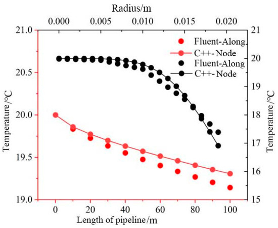 The heat transfer and pressure drop characteristics of drilling fluid flow in the surface pipeline during circulation are crucial parameters for determining the appropriate insulation thickness. The model, based on the calculation procedure for drilling fluid flow in the surface pipeline, was validated using Fluent software (2020R2). The validation involved solving the temperature distribution of water-based drilling fluid at the pipeline outlet under the same conditions: a DN40 pipeline with a length of 100 m. The validation results, shown in Figure 1, indicate that our model’s calculations align well with the Fluent data, with a maximum error of 2.82%. For the numerical calculations in this chapter, the external environmental parameters were set as follows: an ambient temperature of −20 °C, a wind speed of 2 m/s, an initial fluid temperature of 20 °C, a thermal conductivity of the pipe wall of 48 W/(m·°C), a specific heat capacity of 483 J/(kg·°C), and a density of 7850 kg/m3.
