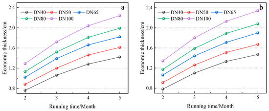 Economic thickness of insulation under different pipe types: (a) rock wool and (b) glass wool.