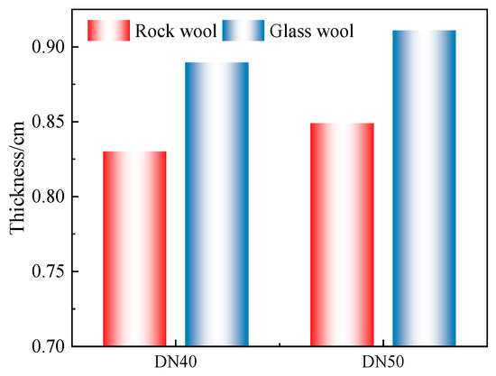 Figure 3 illustrates the insulation thickness required to stay within the maximum allowable heat loss for DN40 and DN50 pipelines, utilizing both rock wool and glass wool as insulation materials. This comparison is specifically for a fixed running time of 1440 h. The data indicate that insulation thickness correlates positively with pipe diameter; larger diameters necessitate greater insulation thickness to maintain thermal efficiency. For instance, the insulation thickness for a DN50 rock wool pipe is 0.85 cm, marginally thicker by 0.02 cm than that for a DN40 pipe. Furthermore, the figure demonstrates that under conditions of maximum allowable heat loss, glass wool insulation requires a thicker layer compared to rock wool. This is attributed to the higher thermal conductivity of glass wool; despite equal heat dissipation losses, glass wool’s thermal properties require a thicker barrier to achieve the same insulative performance. In quantitative terms, the insulation thickness for a DN50 glass wool pipe is 7.30% thicker than its rock wool counterpart. This distinction highlights the critical role material properties play in determining the appropriate insulation thickness for optimizing energy efficiency in pipeline systems.